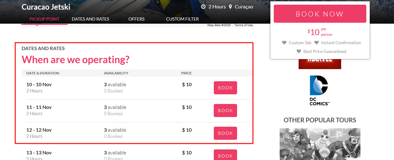 The feature of DATES & RATES allows you to display the available departure dates of the tour on the tour page itself. .
