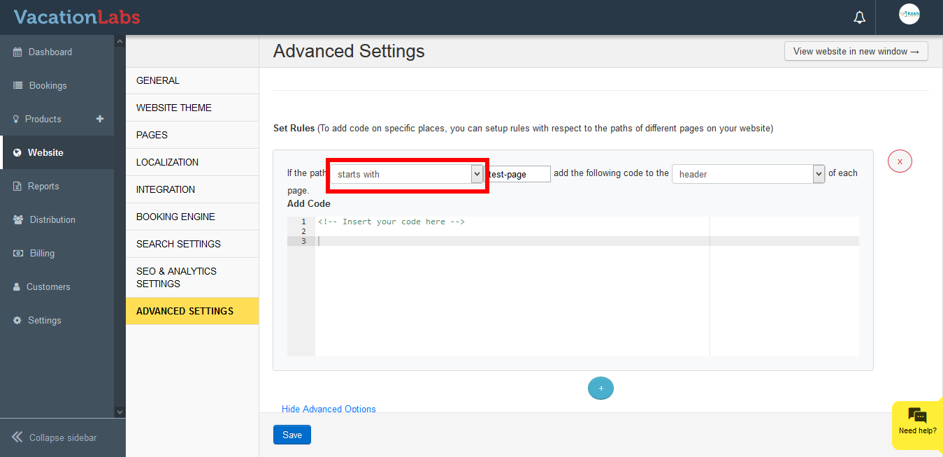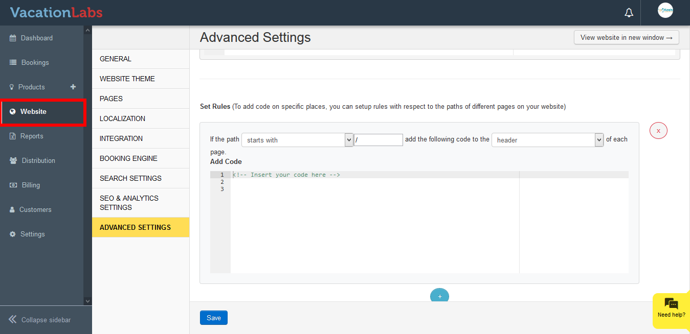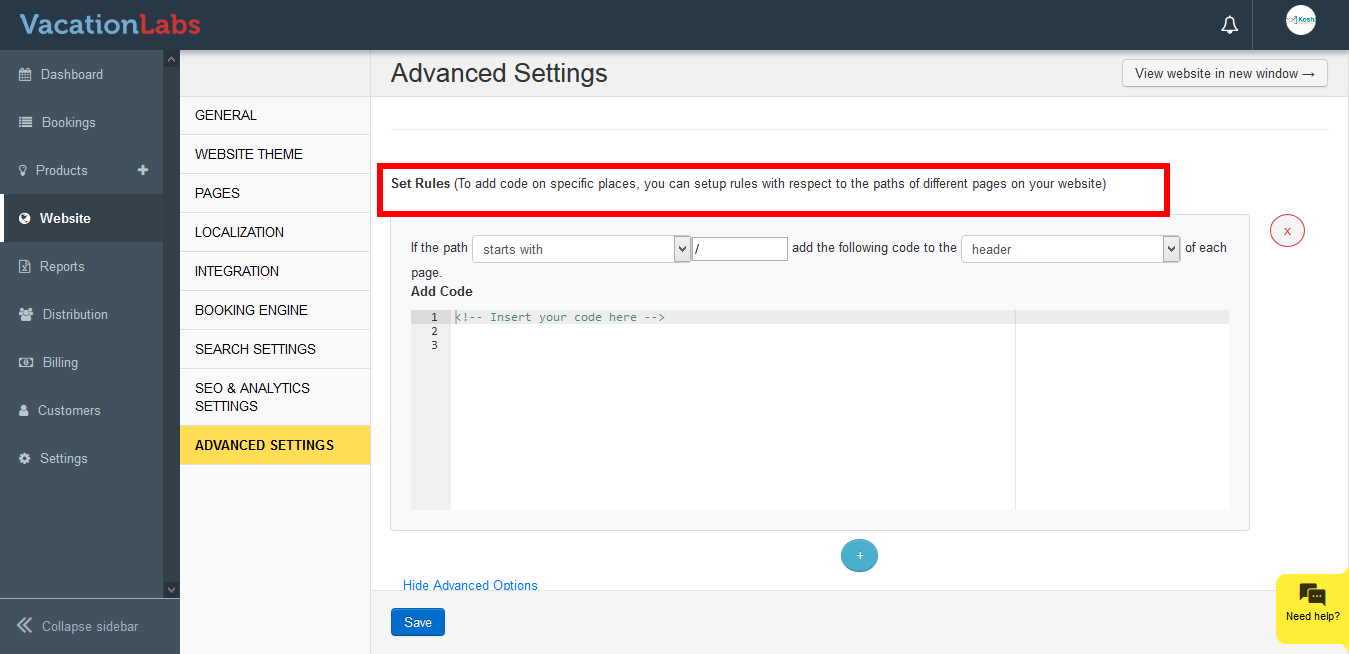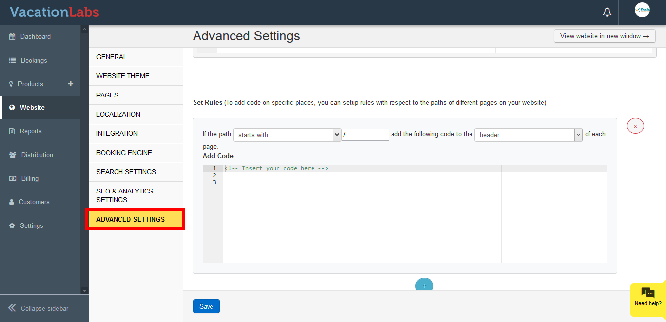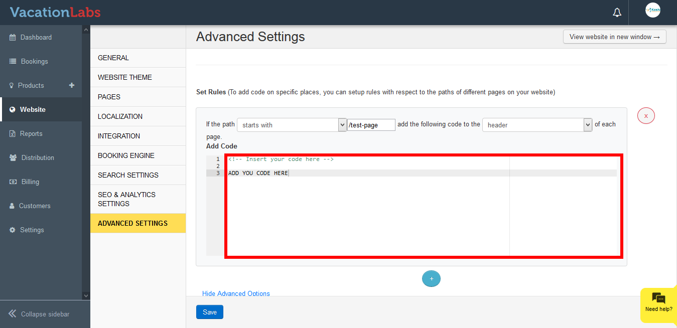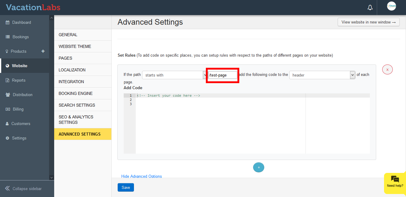The Advanced Settings of the website allow you to add a script/code that can be triggered on a specific page. For example a tracking script that must be triggered on any one tour page because its being promoted or you are running ads for it. You can easily add any number of such scripts, any number of times and configure them to be triggered on any pages on the website.