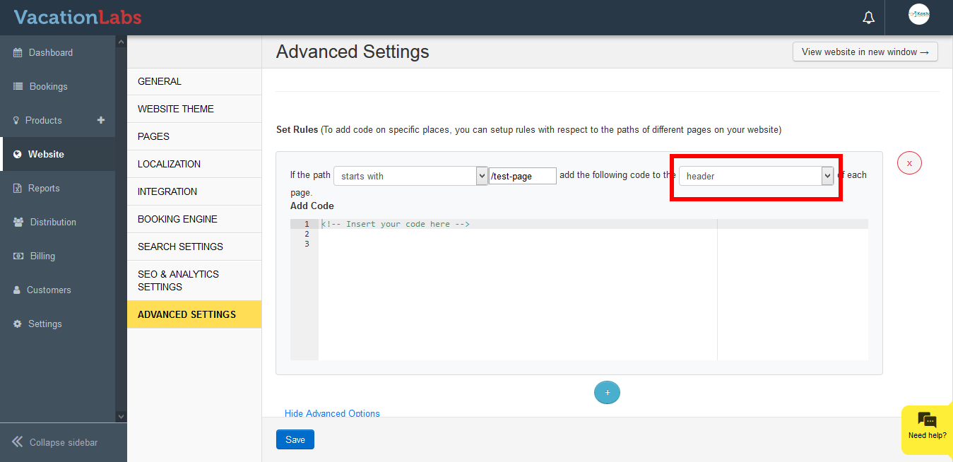 Select whether you wish to add the code in Header/Footer from drop-down Header: If you select Header and Save the code then the code added will be saved in the Header (<head> tags) of the page.Footer: If you select Footer and Save the code then the code added will be saved in the Footer ( before </body> tags) of the page.