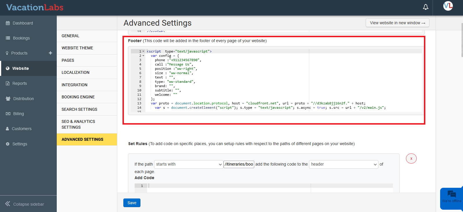 To add a floating chat/WhatsApp/messenger widget, please paste the script by navigating to Website > Advanced Settings > Header/Footer. Here, you can paste the script obtained from any chat / messenger platform.