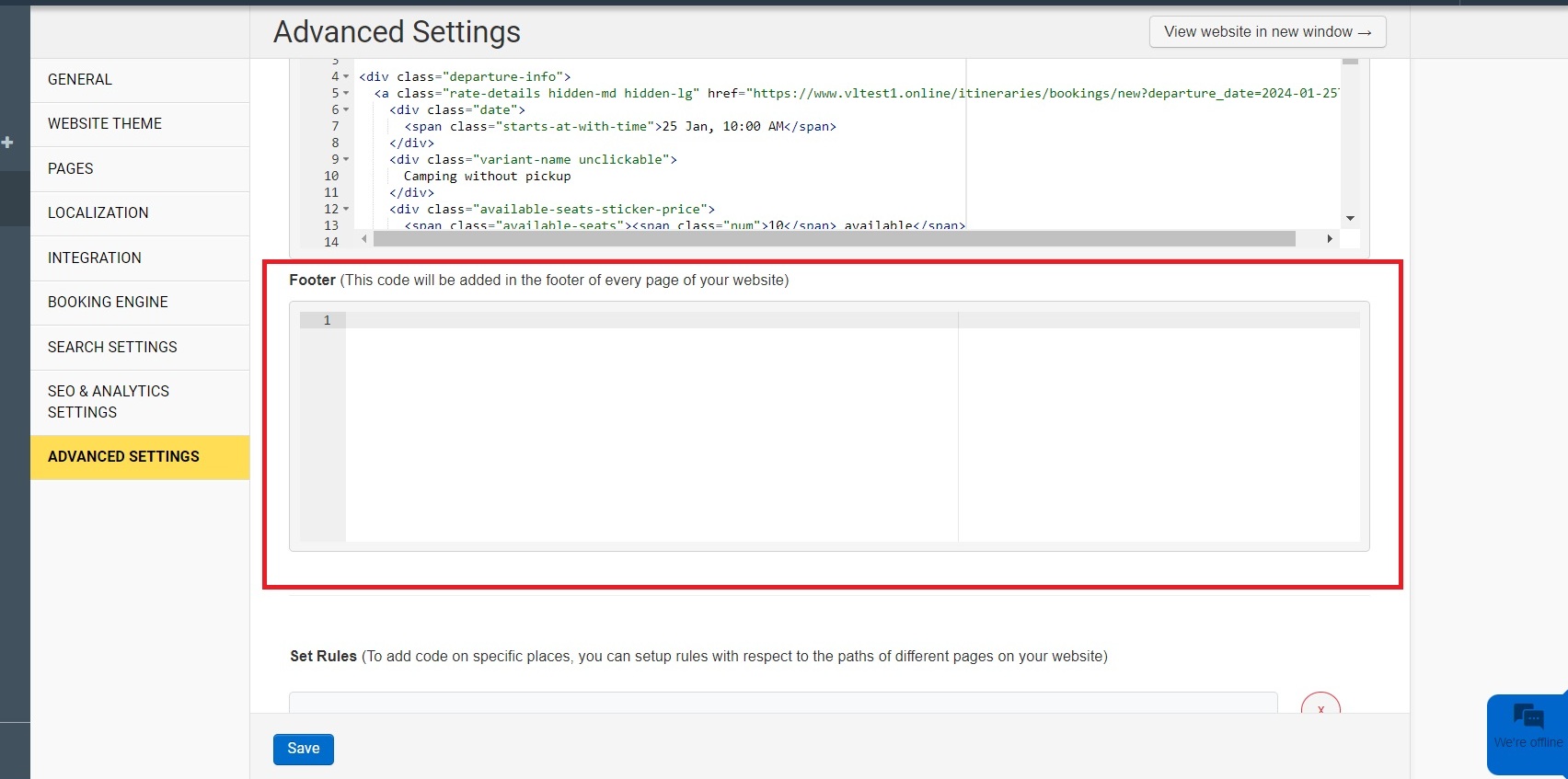 Navigate to the Vacation Labs login and go to Website > Advanced Settings. Paste the copied code into the Footer section.