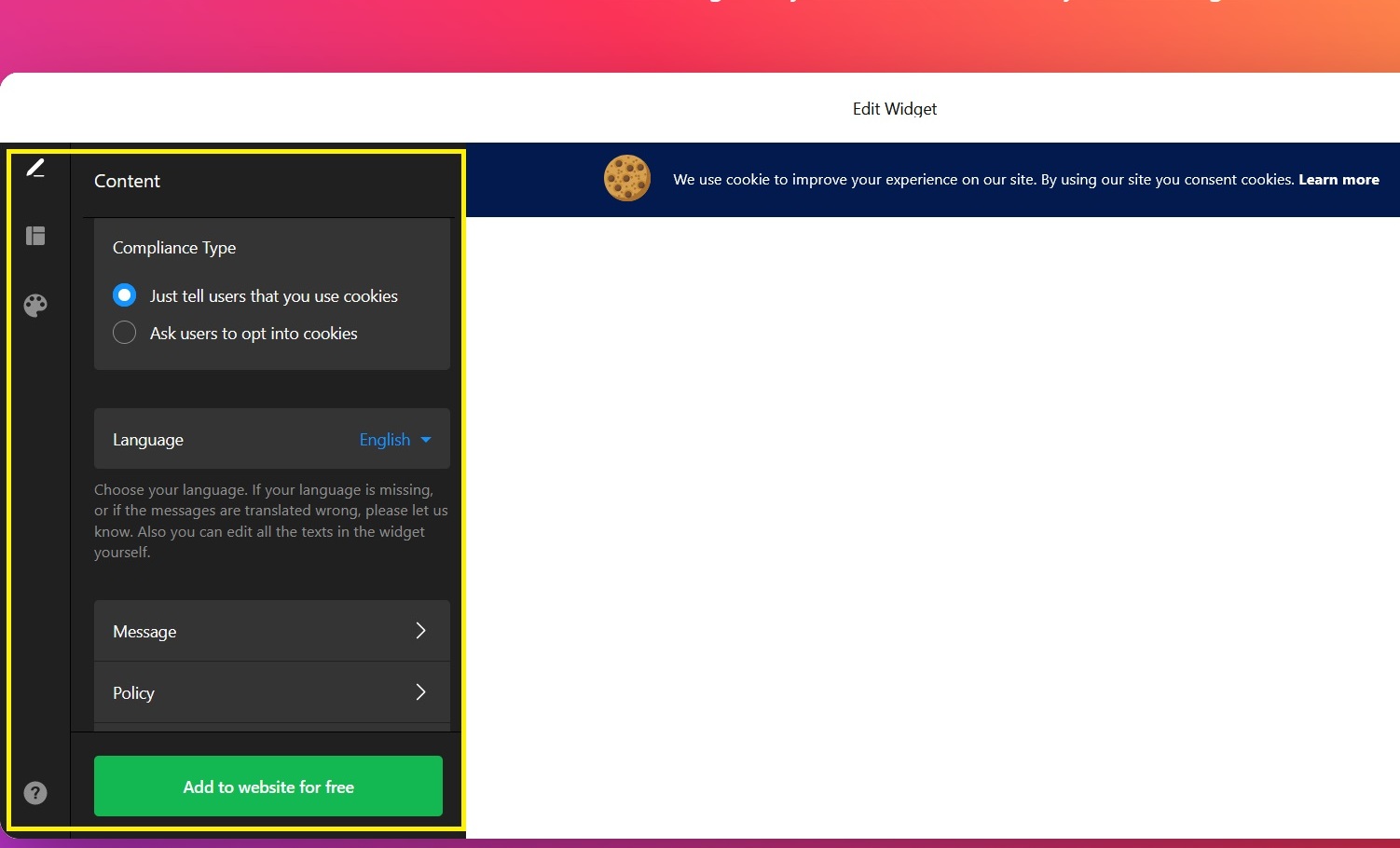 Now on the left hand side you will be able select the Compliance type and edit things such as message, policy, cookie icon etc, once done click on “Add to Website for free”