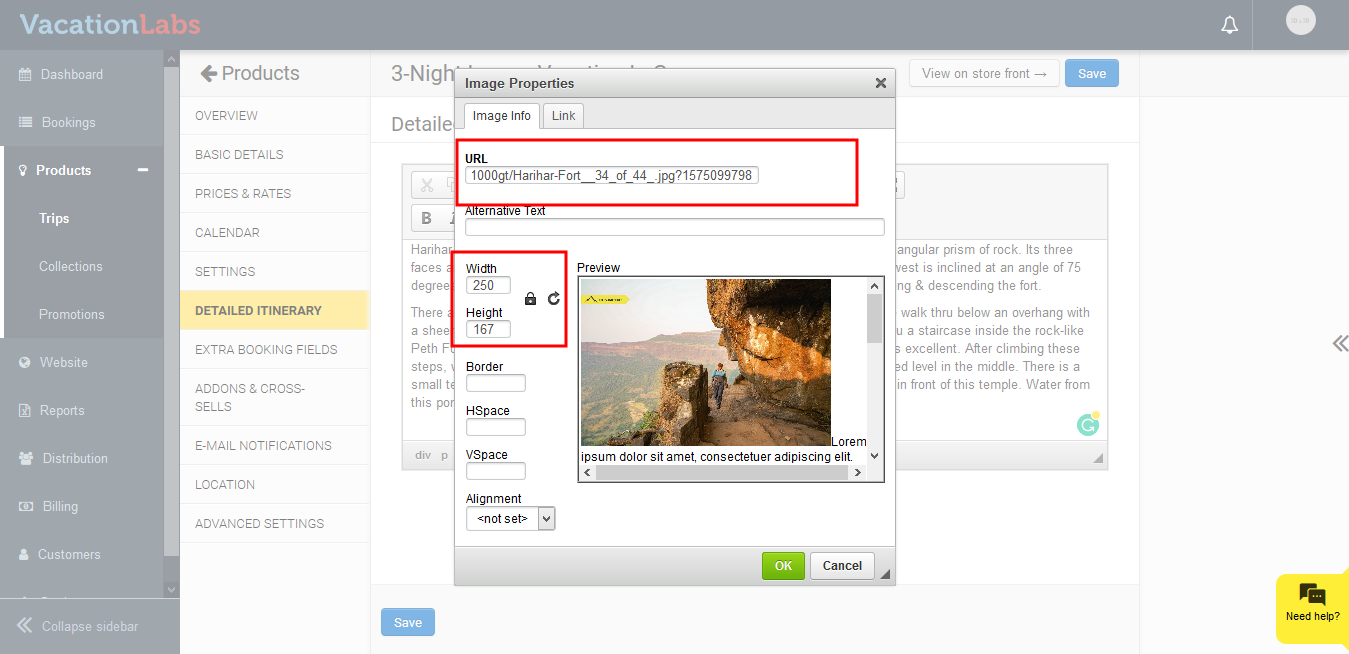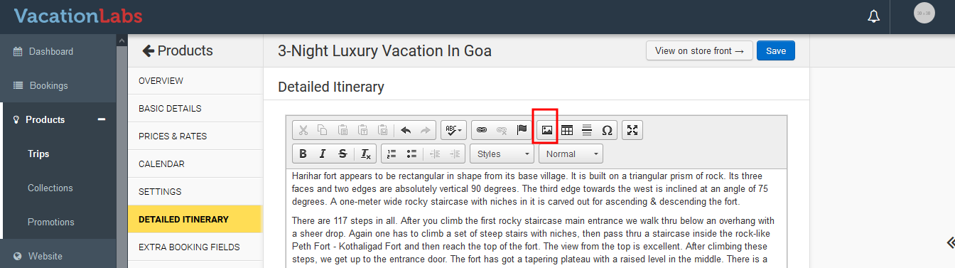 Navigate to Products > Trips > Edit the trip > Detailed Itinerary. Here, in the Rich Text Editor, keep the cursor where you wish to add the image and click on the Image Icon at the top.