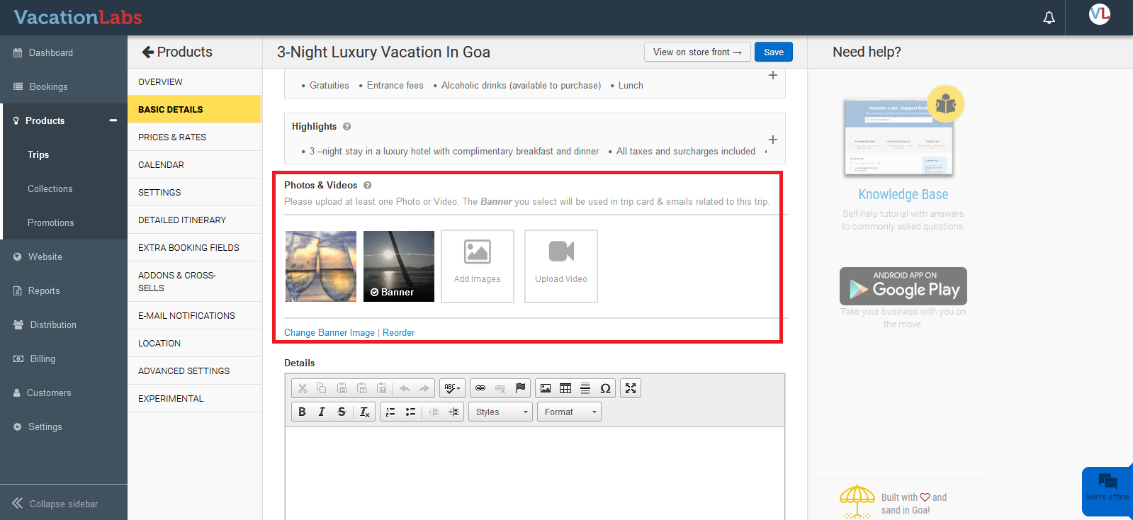 Upload all images you want to add to the itinerary in the relevant tour by navigating to Products > Trips > Edit the trip > Basic Details. Here, under Photos & Videos, you can upload all images. To learn more about how to upload images to the tour gallery, please CLICK HERE.
