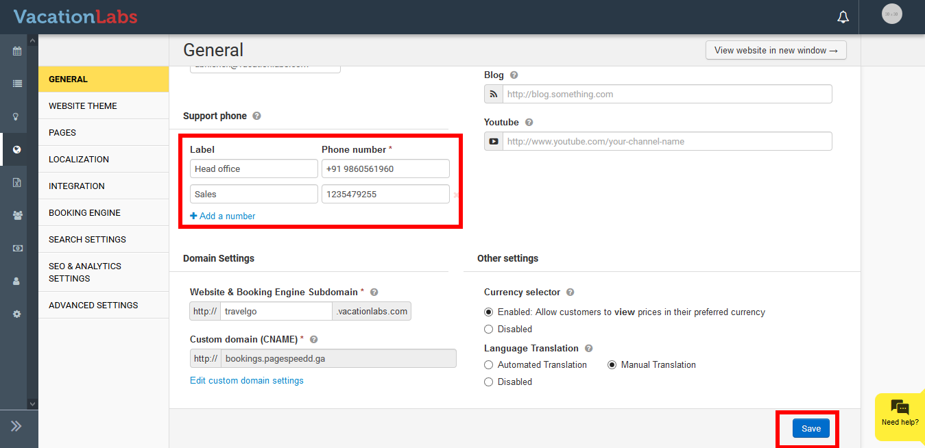 You can update the support phone number(s) displayed on your website directly from your Vacation Labs account.