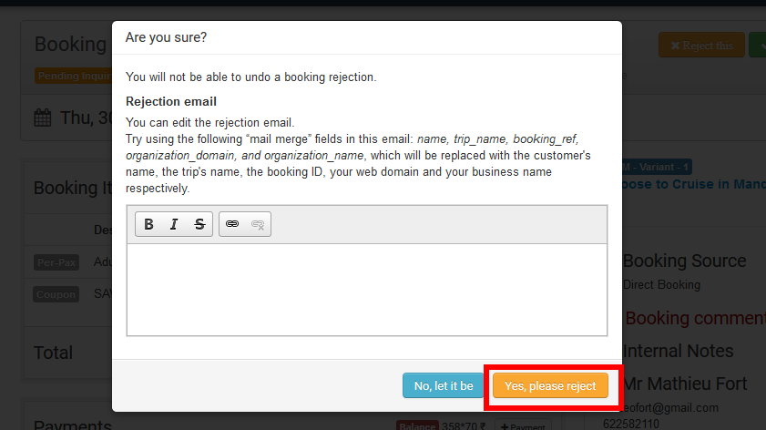 Enter any reason you wish to inform the customer for rejecting the booking
