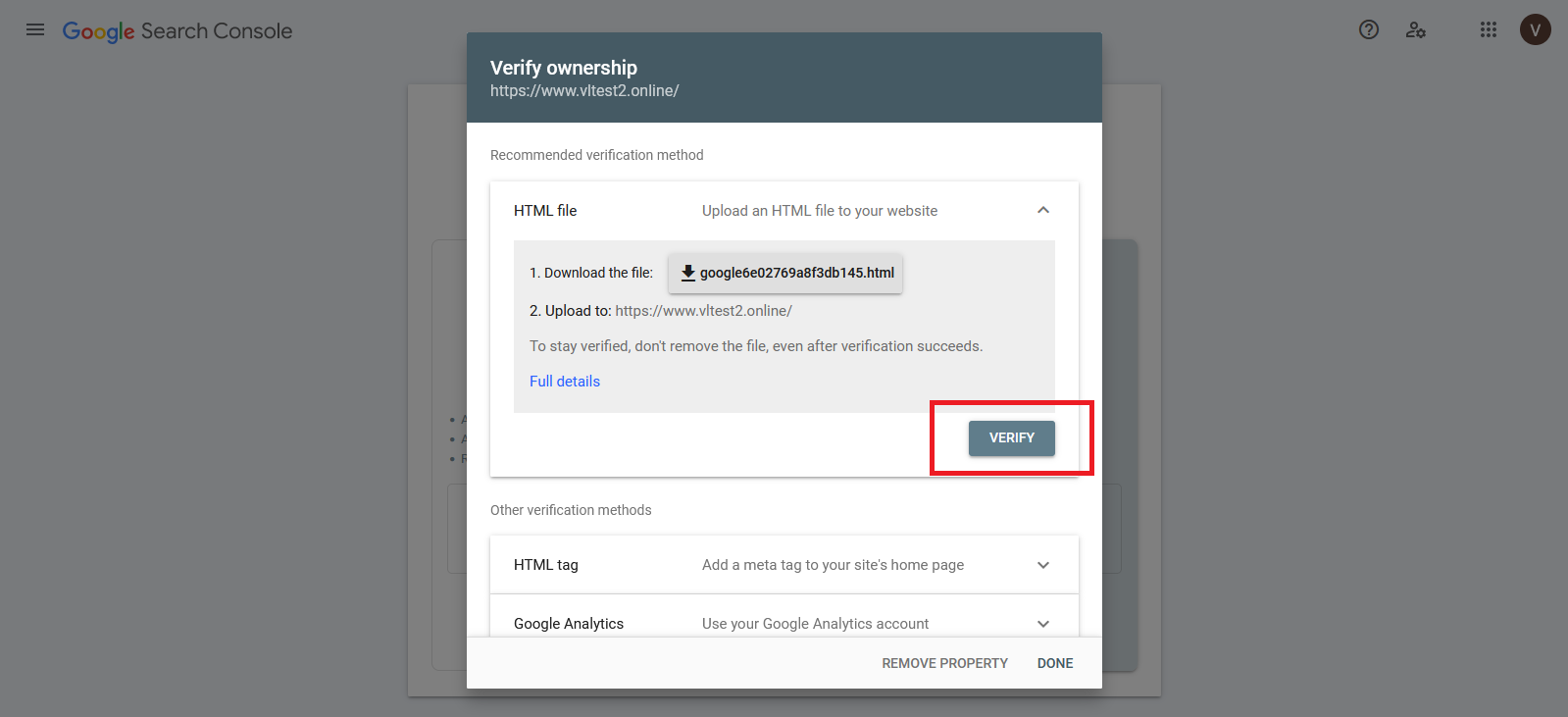 After that, go back to the Google Search Console page and click on the Verify button to check whether GSC is connected to your website.