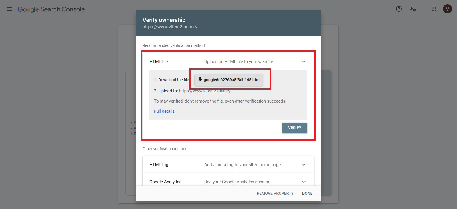 Select the HTML file verification method and click on the download button, which will download the HTML file.