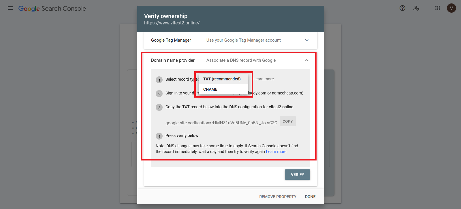 Once the record is added, you can click on the Verify button to check whether GSC is connected to your website.