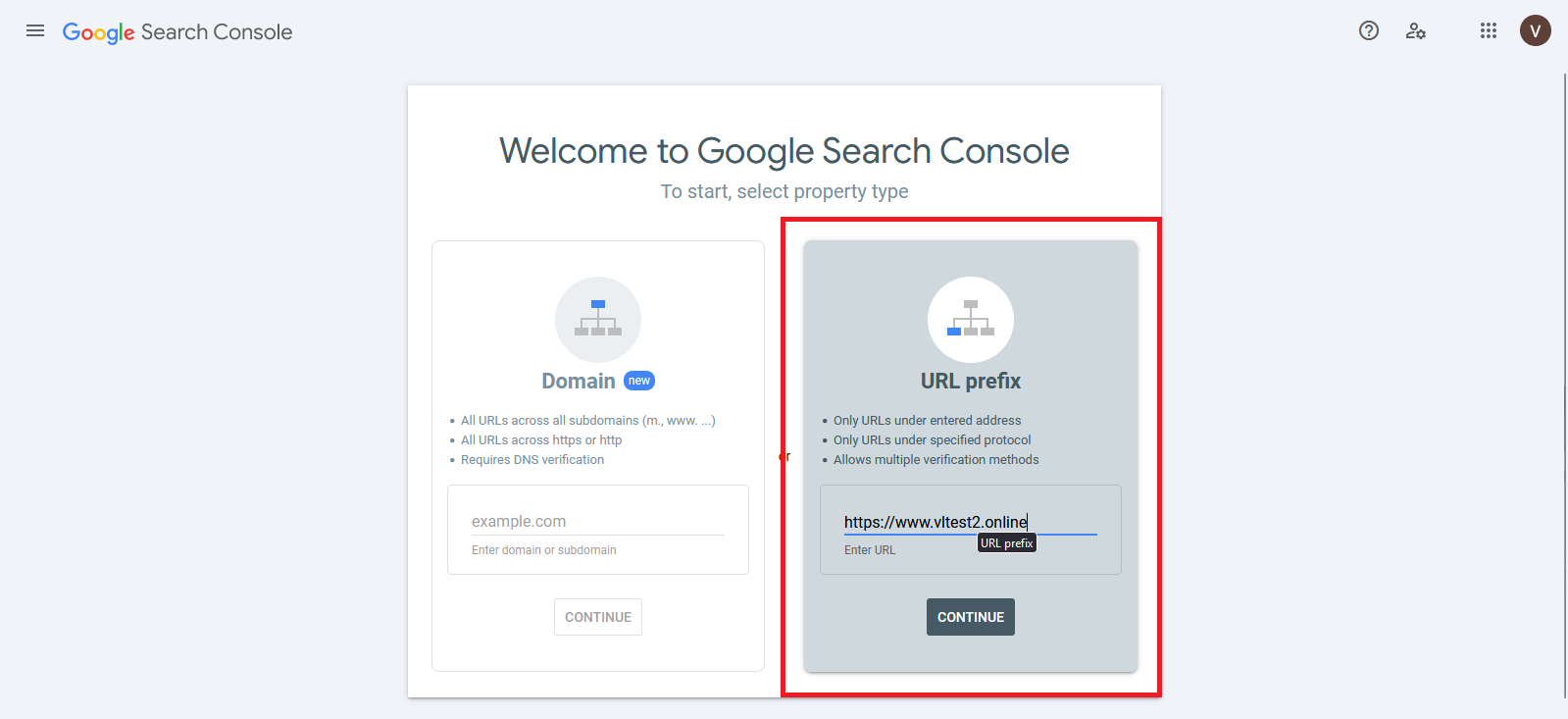 When you click this URL, you will be redirected to GSC verification. Select the URL prefix method, and you will have many options to verify your domain. Here, you add your website URL completely and click on continue.