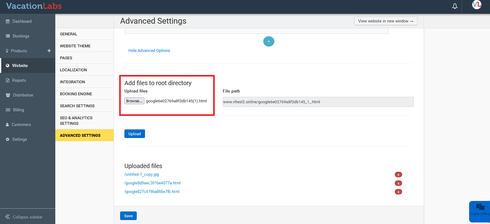 Now you need to upload the file to the root directory of the website. To do this, log in to your Vacation Labs account and navigate to Website > Advanced Settings > Add files to root directory. Here, you can upload the downloaded file and save the changes.