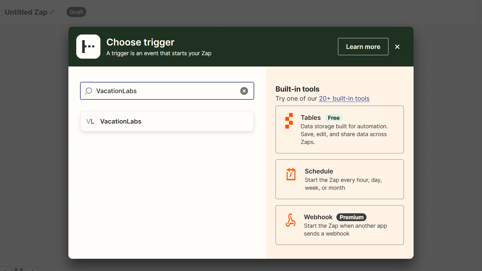 Connecting Vacation Labs as a trigger in Zapier