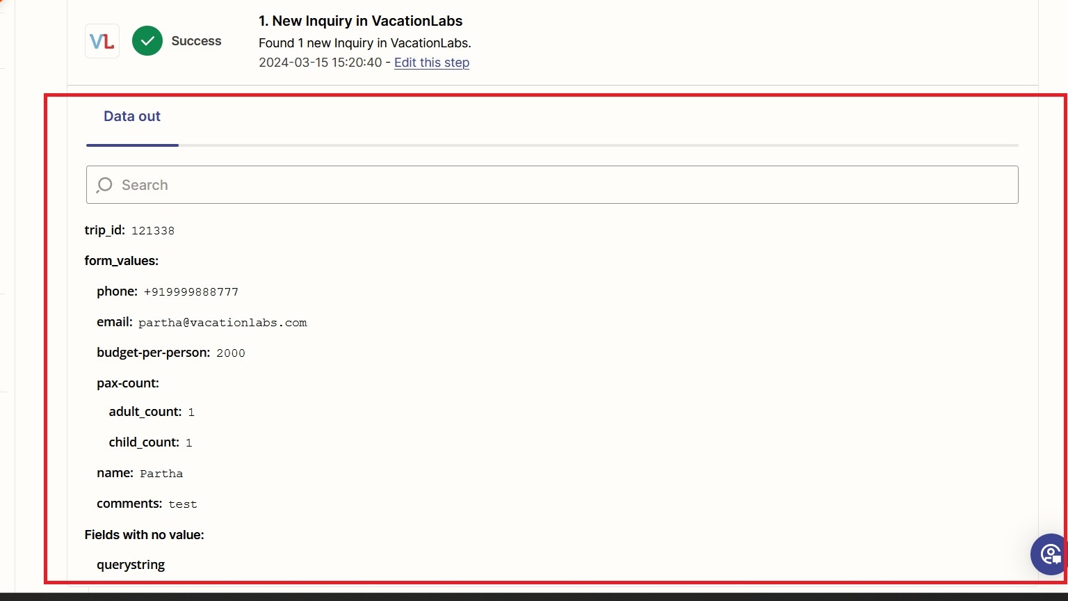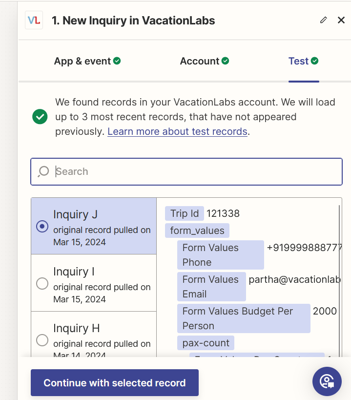 Then on the next page, zapier will import records from your Vacation Labs account (in this case recent pop up enquiry form submissions have been imported) refer screenshot below