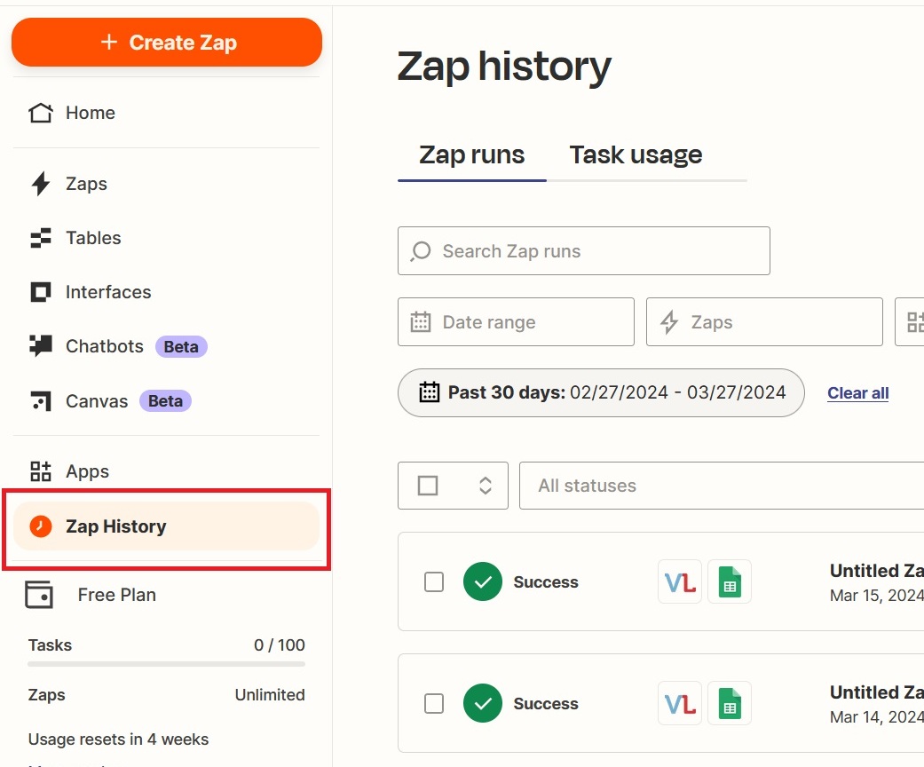 2. Once it is submitted, login to Zapier and click on Zap History(refer screenshot below)