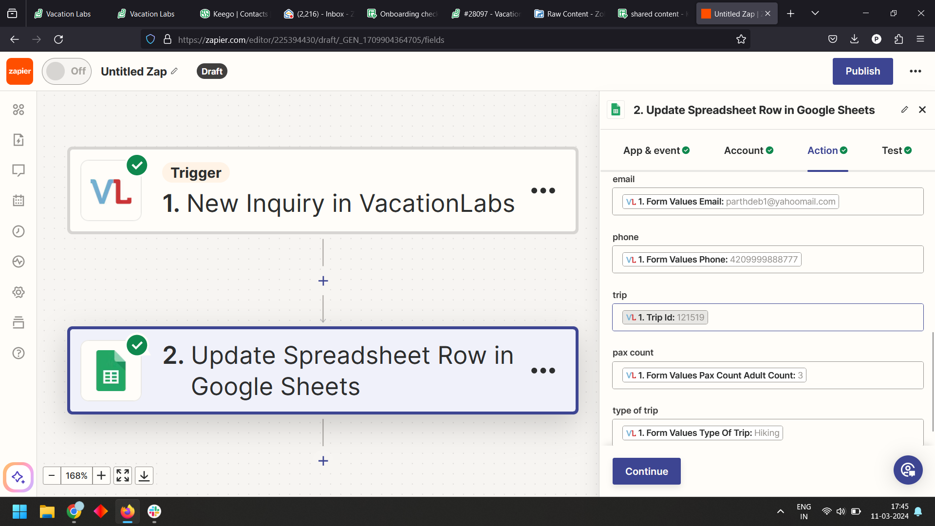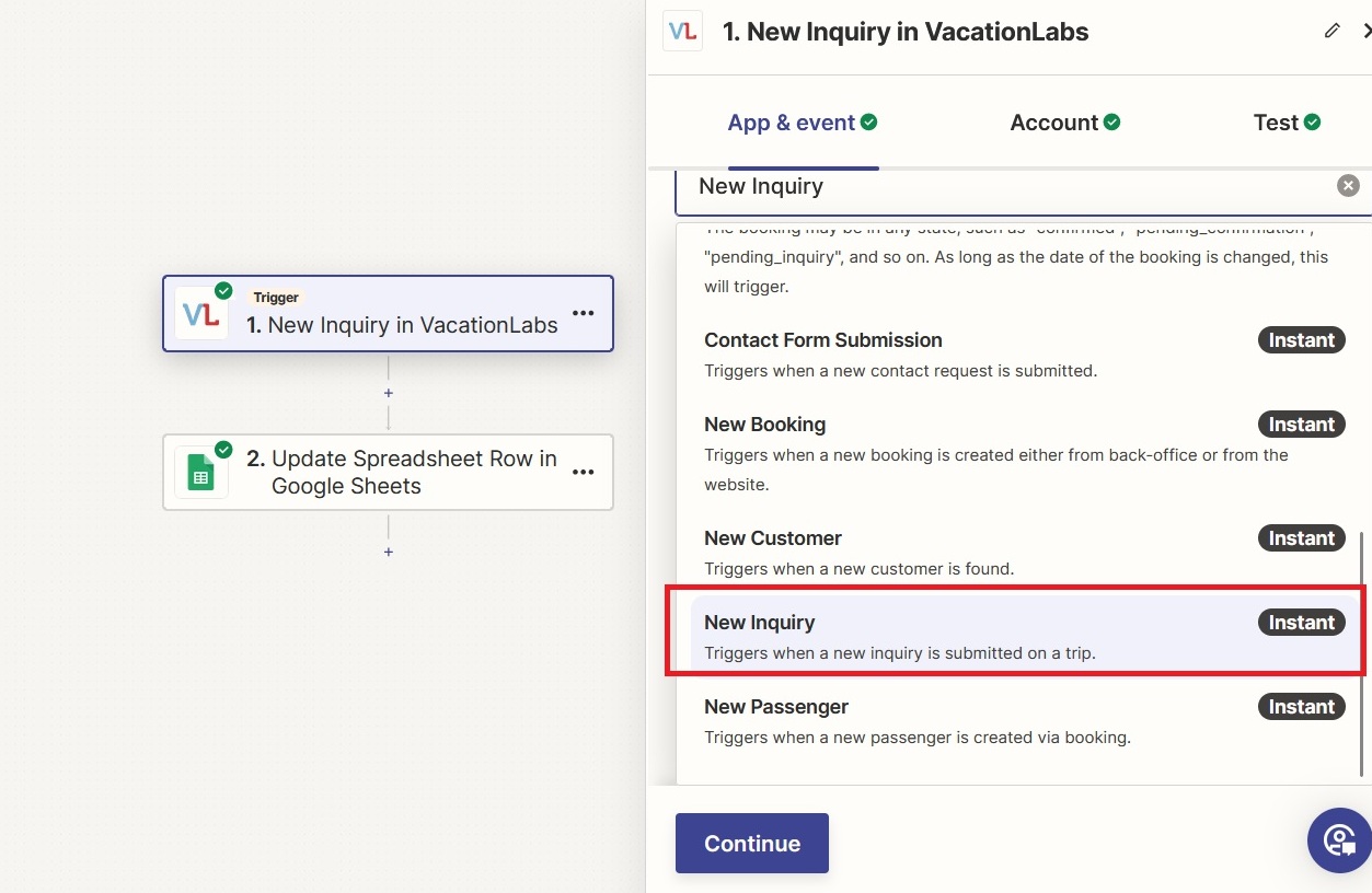 Pushing all inquiries from Vacation Labs to Google Sheets using Zapier