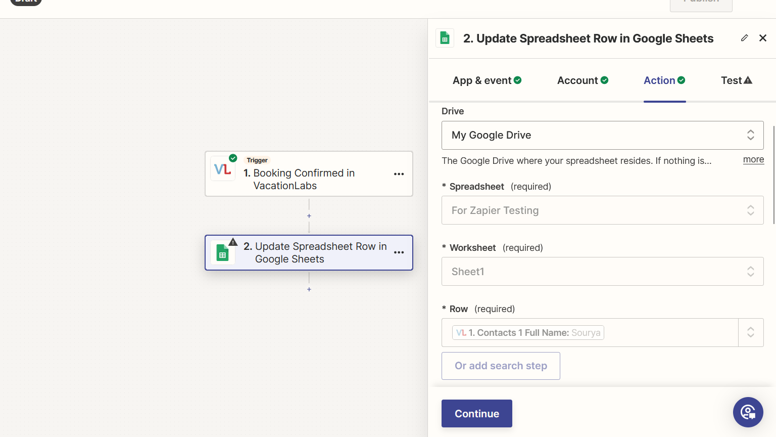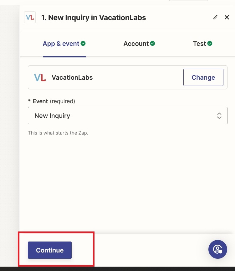 On the next page you will need to connect your Vacation Labs account (if not already connected via apps) and then click on continue. Please CLICK HERE to get detailed instructions on how to connect your Vacation Labs Account with Zapier.