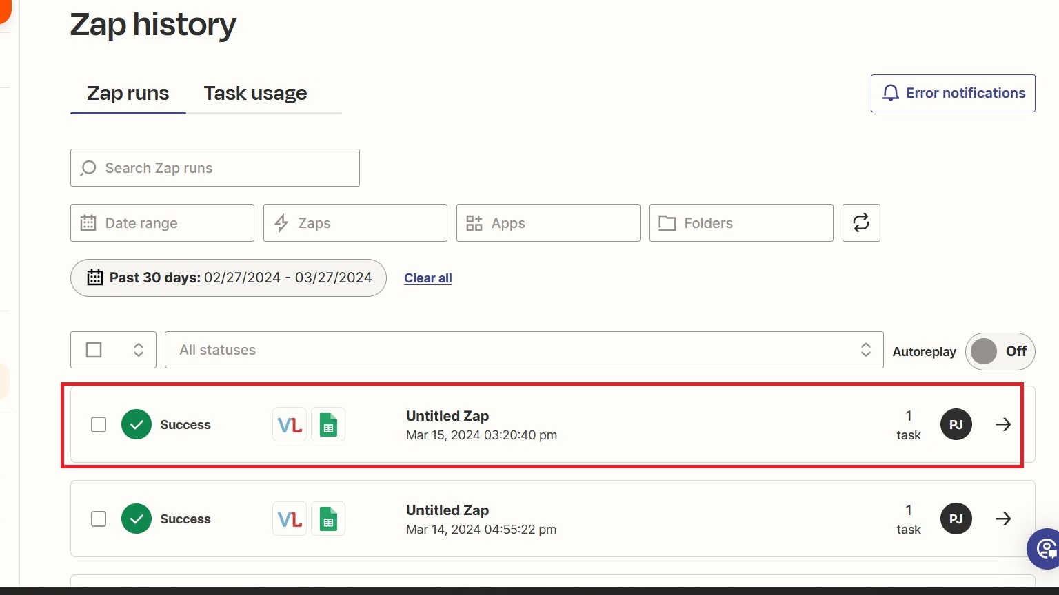 3. Locate the Workflow based on the time and click on it (in this example the workflow is of Untitled Zap and ran on 15 March 2024 3:20 PM so we will click on it