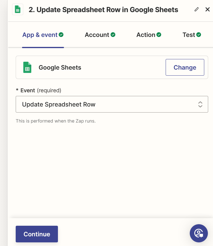 2. Select your desired event such as create worksheet, updated worksheet raw etc.In Zapier, when you select Google Sheets as the action, you’re specifying what should happen within a Google Sheets spreadsheet as a result of a trigger event from another application. For example: Create Spreadsheet Row: This action adds a new row of data to a specified Google Sheets spreadsheet. Update Spreadsheet Row: This action updates an existing row in a specified Google Sheets spreadsheet with new data. Append to Spreadsheet: This action adds data to the end of a specified sheet within a Google Sheets spreadsheet. Create Spreadsheet Worksheet: This action creates a new worksheet (tab) within a specified Google Sheets spreadsheet. Find Spreadsheet Row: This action searches for a specific row in a Google Sheets spreadsheet based on specified criteria. By choosing one of these actions, you’re instructing Zapier to perform a specific task within your Google Sheets spreadsheet based on the trigger event from another application.
