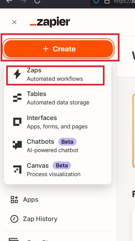 Click on Create and then on Zaps (refer screenshot below) T