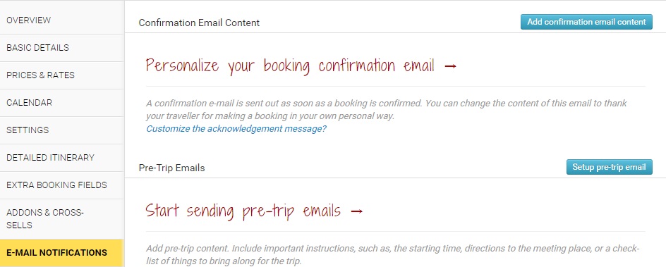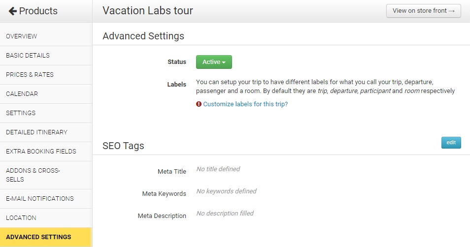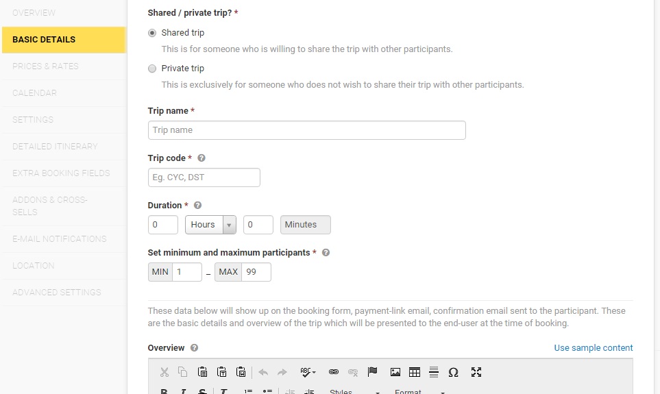 Overview section gives an outline of your tour/trip/activity. This is the information that will be displayed on the storefront regarding your trip.