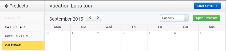 Calendar is the page where you open time slots on different days for which the tour/activity will be conducted.You have an option to Open timeslots on the top of the page.