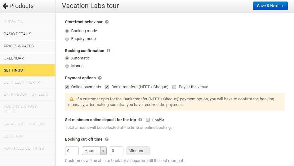 This page gives you the flexibility to customize the behaviour of your store front. There is a high level of uncertainty that the tour operators have to face. Hence the first option is whether the storefront needs to work in enquiry or booking mode.