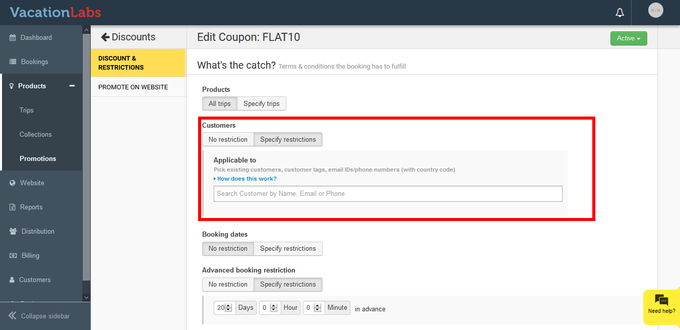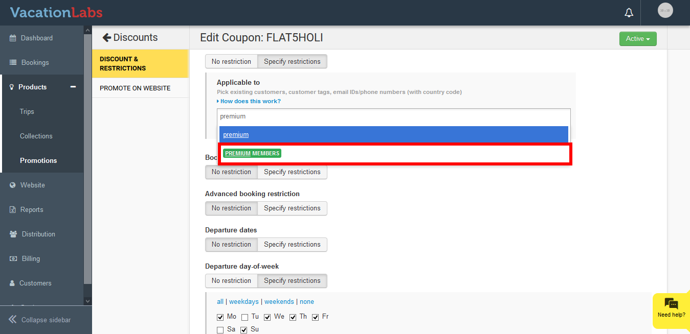 Once the customers are tagged, you can provide them with amazing discount coupons. This helps you to offer great deals and discounts to your different types of customers. If you restrict this coupon to one or more customer-tags, then any customer with that tag will be allowed to use the coupon. The system will recognize the customer based on the Email, Phone entered while making a booking. If the customer has made a booking previously and is tagged to a specific category (for example Premium Members) then the coupon would be applied.