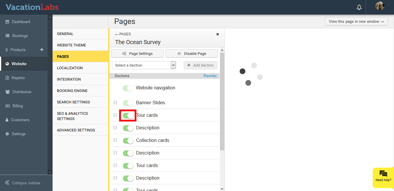 Deactivating the Website Sections in Vacation labs
