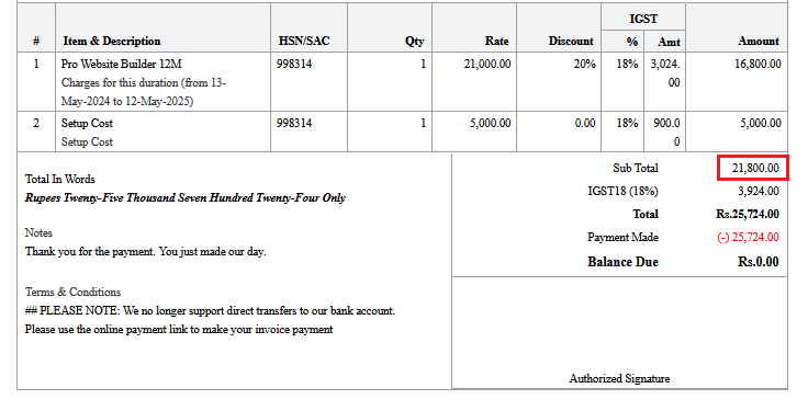 Please note, TDS has to be deducted on the base value of the invoice, i.e. amount excluding taxes (this shows up as a Sub-total on most invoices). For example, TDS under section 194C, for the below invoice will be 2% x 21,800 = Rs 436