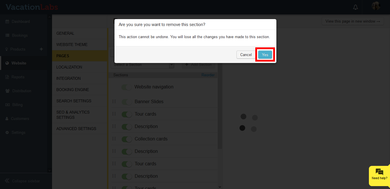 - Click on the Yes to delete the section.