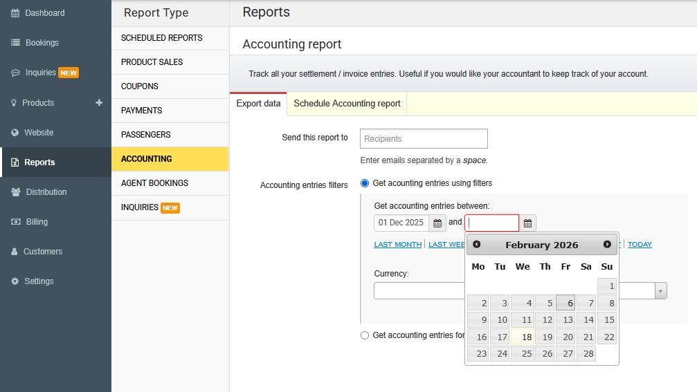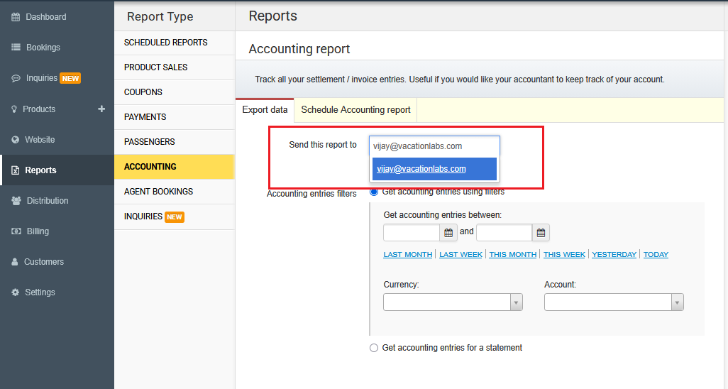 1. Go to Reports > Accounting in the Admin Panel. 2. Enter a valid email address to receive the report.