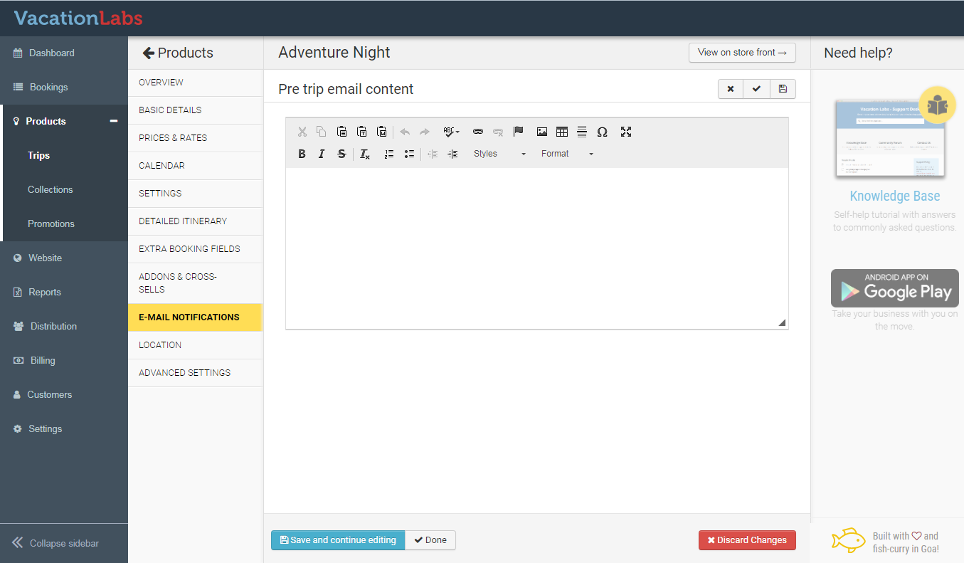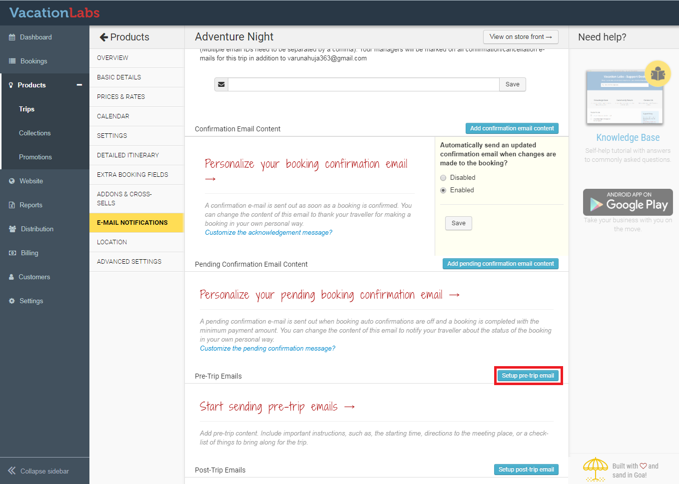 To set up a Pre-Trip email, log in to your Vacation Labs admin panel and navigate to Products > Trips. Edit the trip you want to update, then go to the Email Notifications section and select Setup Pre-Trip Email****s.