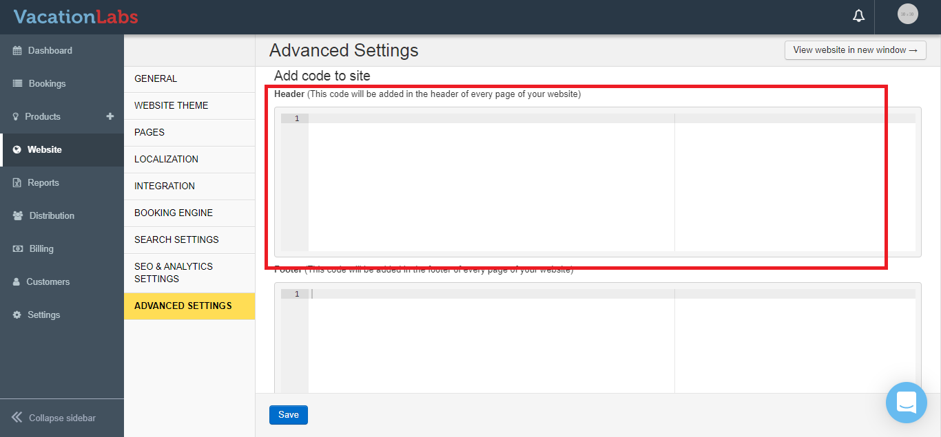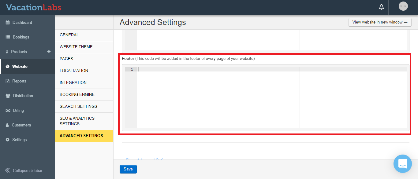 - Go to WEBSITE > ADVANCED SETTINGS > FOOTER and paste the Part 1 of the code here(See screenshot below for reference)