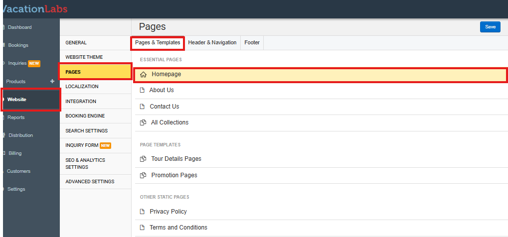 Within the Website section, click on Pages.