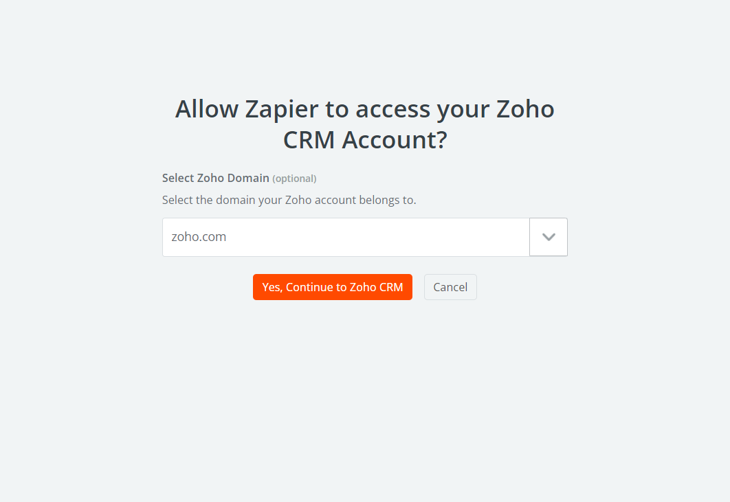 3. A pop up will appear, here you add/select the information they are asking (in this example asking for domain- in this we will select zoho.com since our account is on that domain) and click on Yes, continue to Zoho CRM (refer screenshot below)