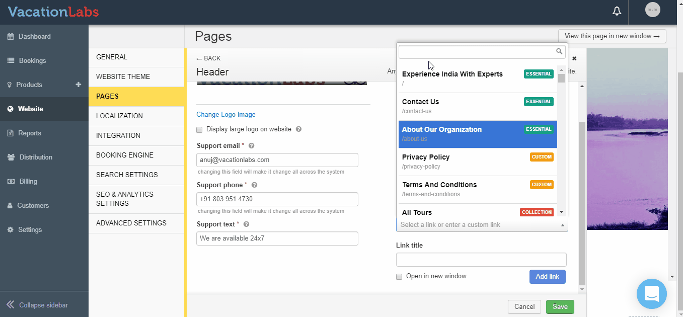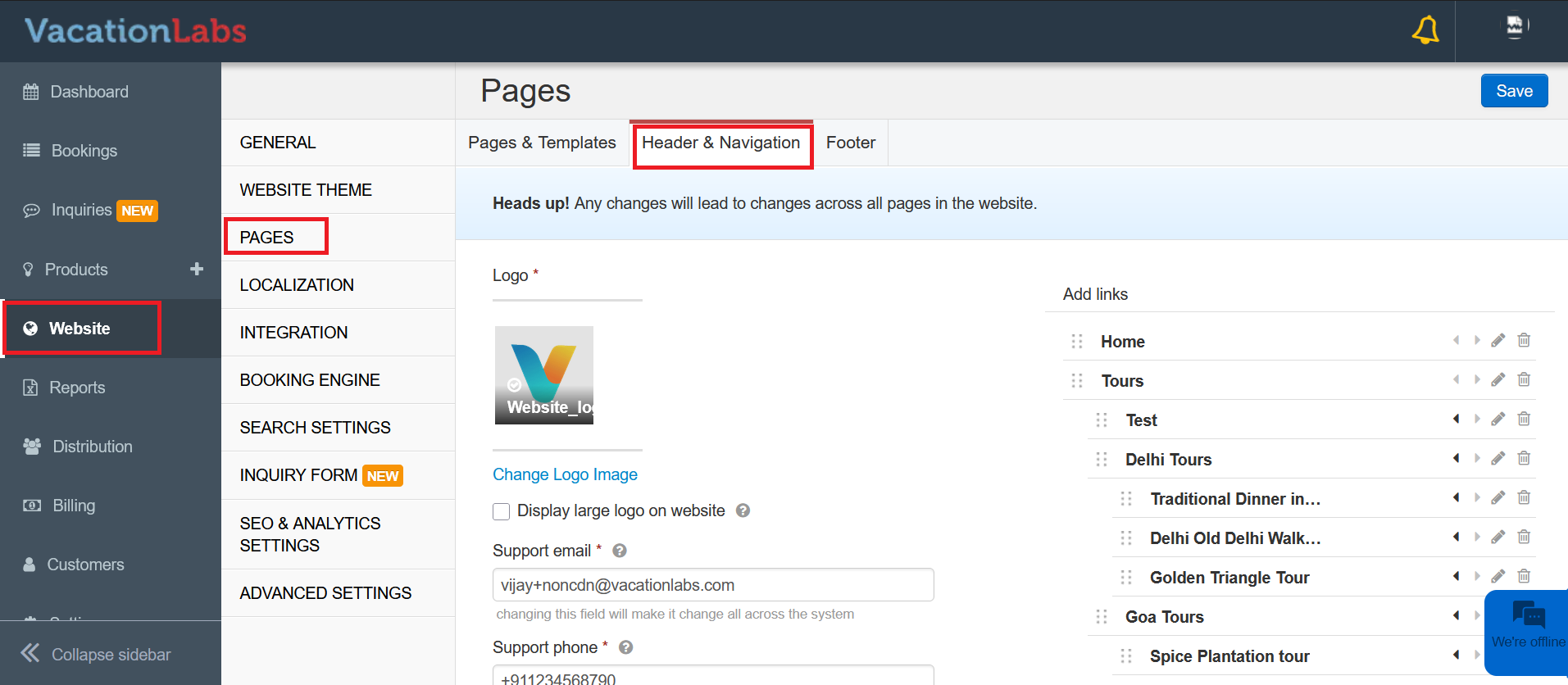 1. Navigate to WEBSITE > PAGES > Header & Navigation.