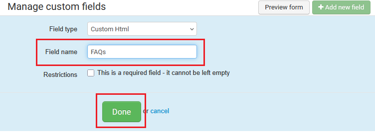 After that, choose Field Type as Custom HTML. Provide a Field Name that you’d like to use as the section title, then click Done.