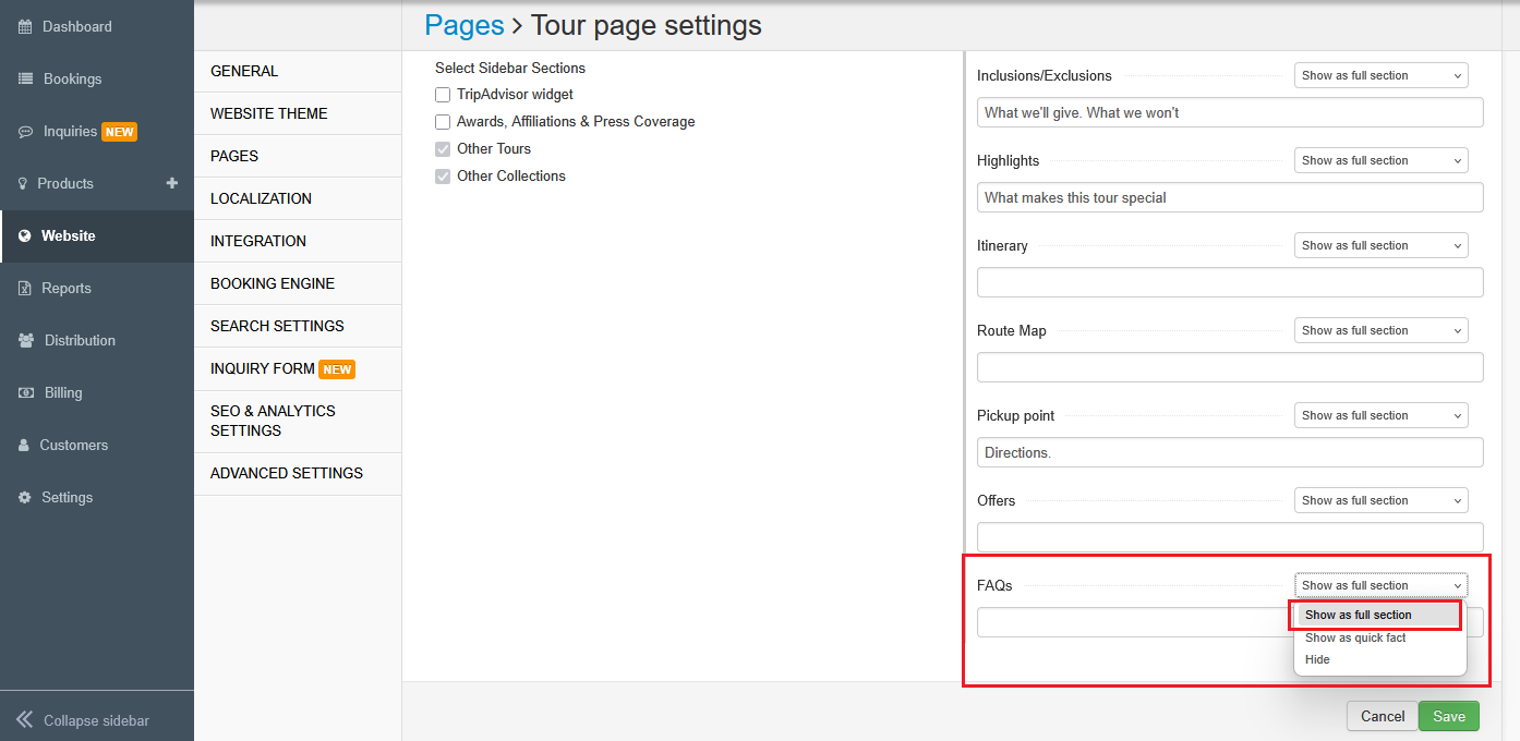 After adding the Custom HTML field, go to Website > Pages > Tour Details Page. Under Page Sections, you’ll find the newly created Custom HTML field.