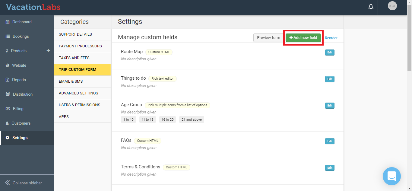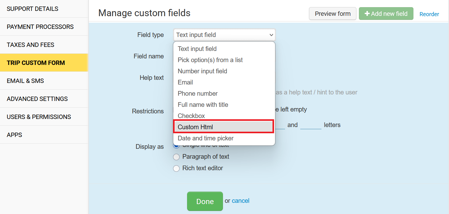 To add a Custom HTML section, go to Settings > Trip Custom Form, then click on Add New Field