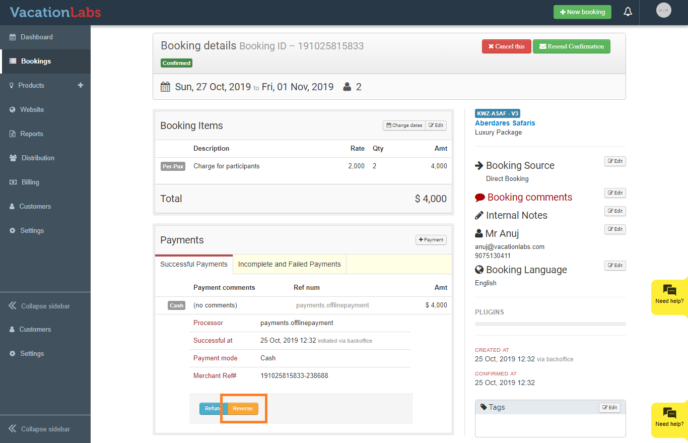 - Offline payments - collected via cash, cheque or bank transfers and they can be removed or deleted by clicking on the REVERSE button on the payment entry