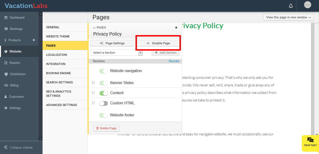 You can always disable or delete a webpage if you wish to remove it from your website. If you wish to hide the page and don’t want the visitor to visit the webpage for sometime then you can use the Disable option. Once the page is disabled it shows an 404 error if someone visits the page.