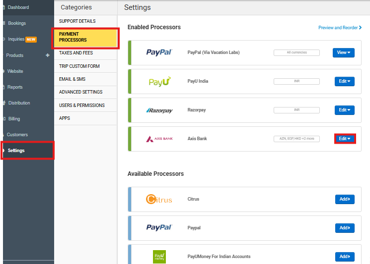 - Within the Settings panel, locate and select the ‘Payment Processors’ section. This will display a list of your currently connected payment gateways.