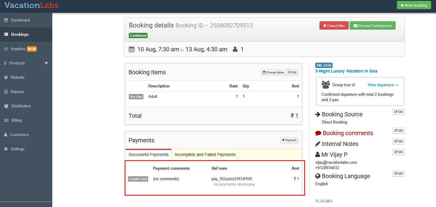 Here, you can either refund a partial amount by entering the desired value, or refund the entire amount by clicking the “Refund entire payment of ₹X?” button to autofill the full amount and click Refund Payment button.