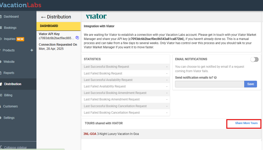 This guide walks how to seamlessly connect your Vacation Labs tours with Viator to synchronize availability and streamline your booking management. This integration allows you to efficiently distribute your tours across both platforms while maintaining real-time updates.