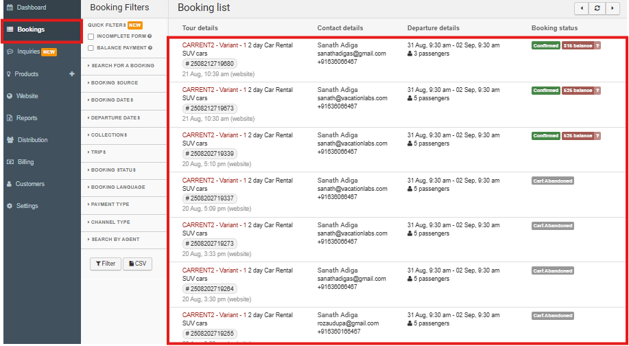 Booking Status: The current state of the booking (e.g., Confirmed, Pending, Incomplete, Cancelled). Monitor this column to identify bookings requiring follow-up action.