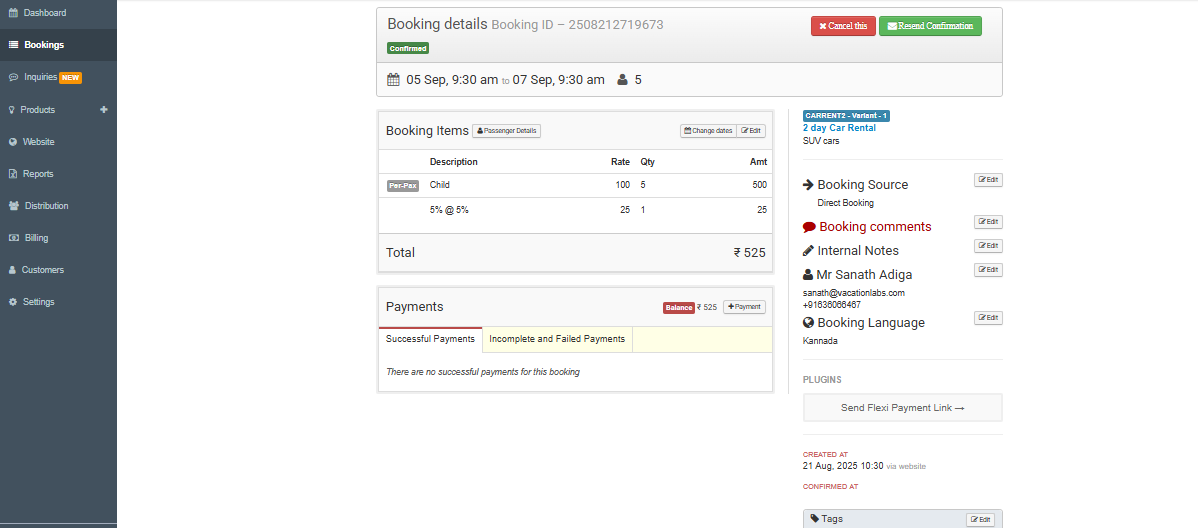 This detail page contains all pertinent information, including customer details, trip itinerary, cost breakdown, and payment history. From here, you can edit dates, adjust pricing, and update payment information.