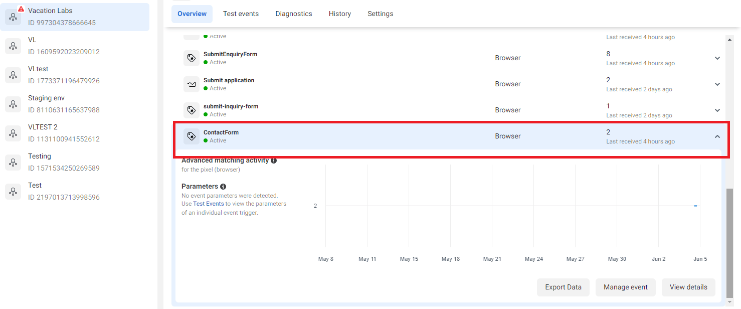 After this, navigate to the website and submit the inquiry form. After some time, the conversion starts recording in the Meta Pixel.