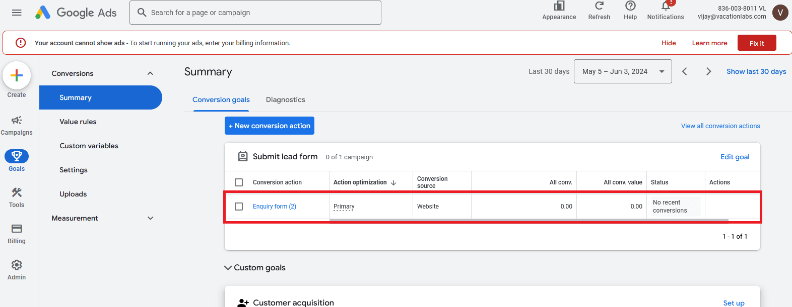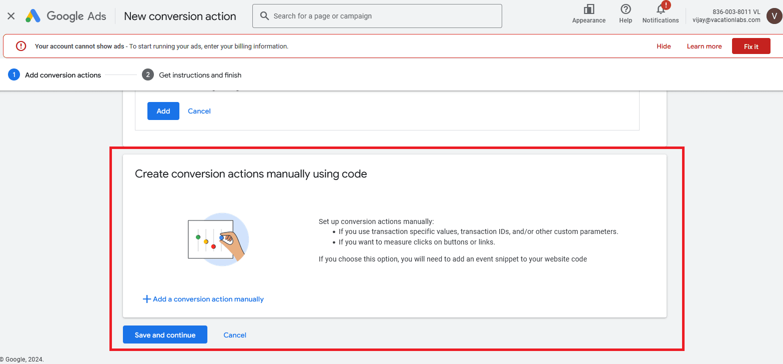 For this, we have taken an example of tracking the inquiry form submission. To track the conversion of an inquiry form submission, create a conversion action in Google Ads using the manual method.