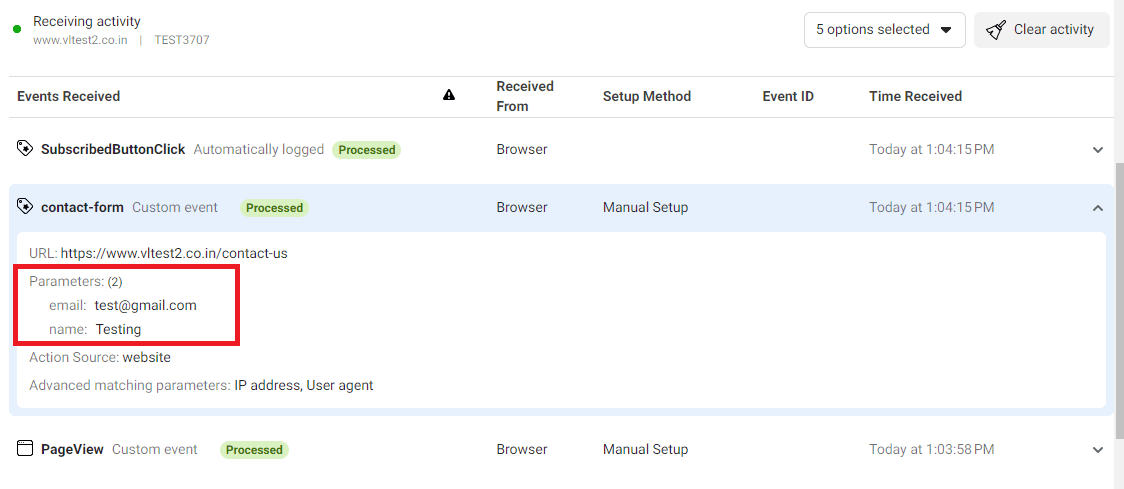 Afterward, navigate to the website and submit the contact form to trigger the event. After submitting the contact form, navigate to the Meta account and verify the custom event. After some time, the conversion starts recording in the Meta pixel.