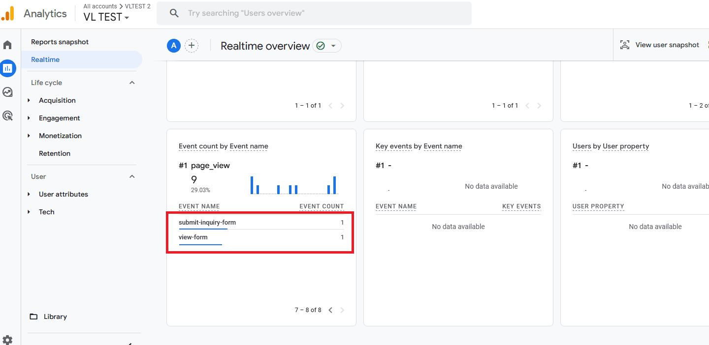 After this, navigate to the website and submit the tour/popup inquiry form. After that, navigate to the analytics dashboard, click on Reports > Real-time, where you can observe the real-time data.